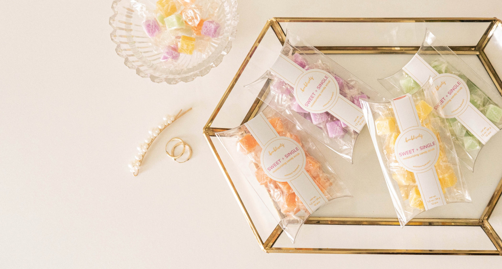 Elevate your travel experience with our carefully curated collection, featuring the Sugar Cube Candy Hand Scrub, Reusable Blooming Travel Towel, luxurious Nourishing Body Oil, and the Bling Brush jewelry cleaner.