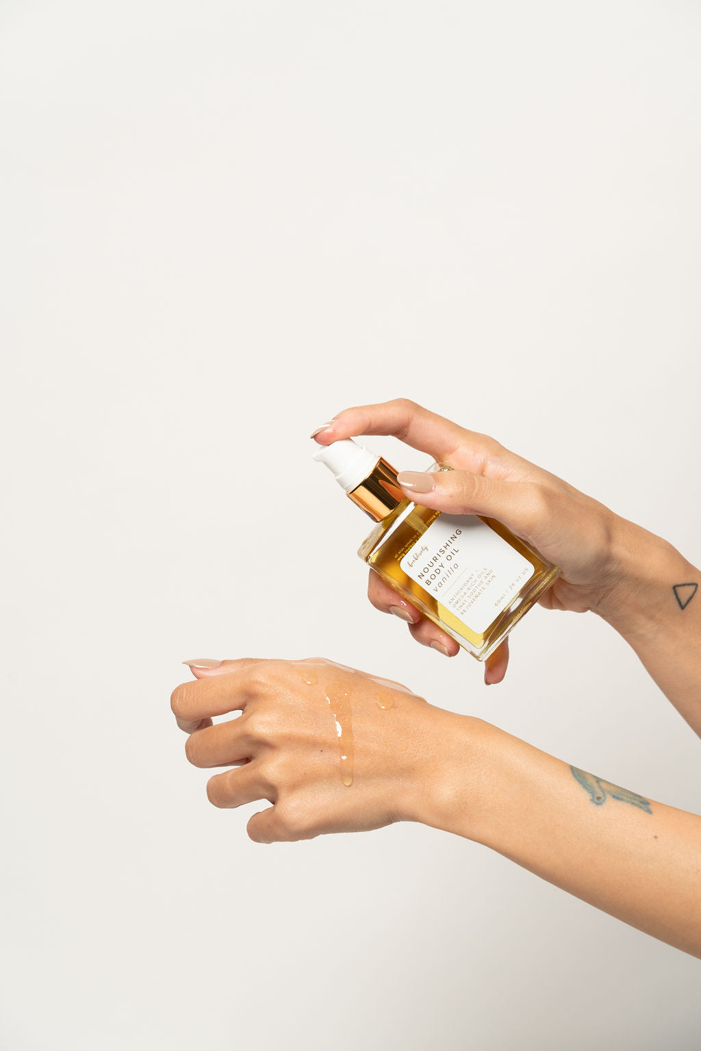 Absolutely! Our body oil is enriched with antioxidants and omega-rich oils like hempseed oil, olive-derived squalane, and rosehip oil, which can enhance the brightness and clarity of tattoos. Regular application on healed tattoos can keep the skin moisturized, making your tattoos appear more vibrant and preventing fading over time. Always ensure your tattoo has fully healed before applying any product.