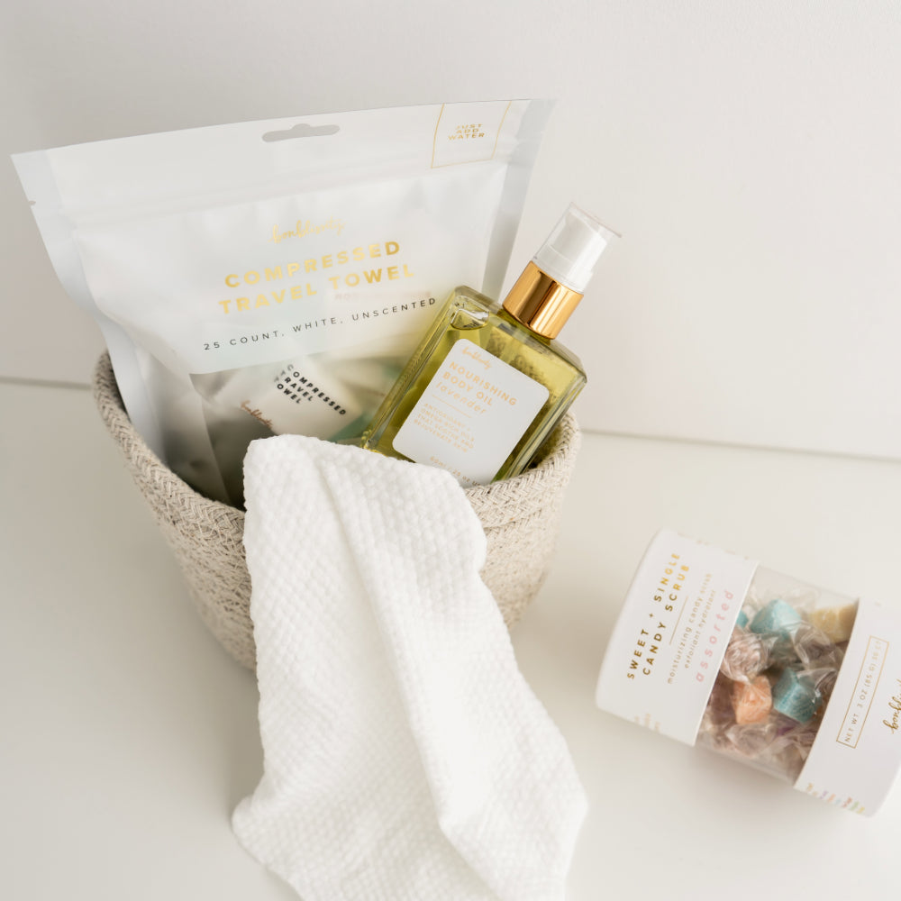 Elevate your travel experience with our carefully curated collection, featuring the Sugar Cube Candy Hand Scrub, Reusable Blooming Travel Towel, luxurious Nourishing Body Oil, and the Bling Brush jewelry cleaner.